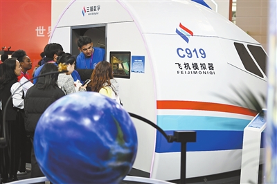 2024年世界职业技术教育发展大会上,来自世界各国的参会者在职业教育专题展上参观C919飞机模拟器。资料图片